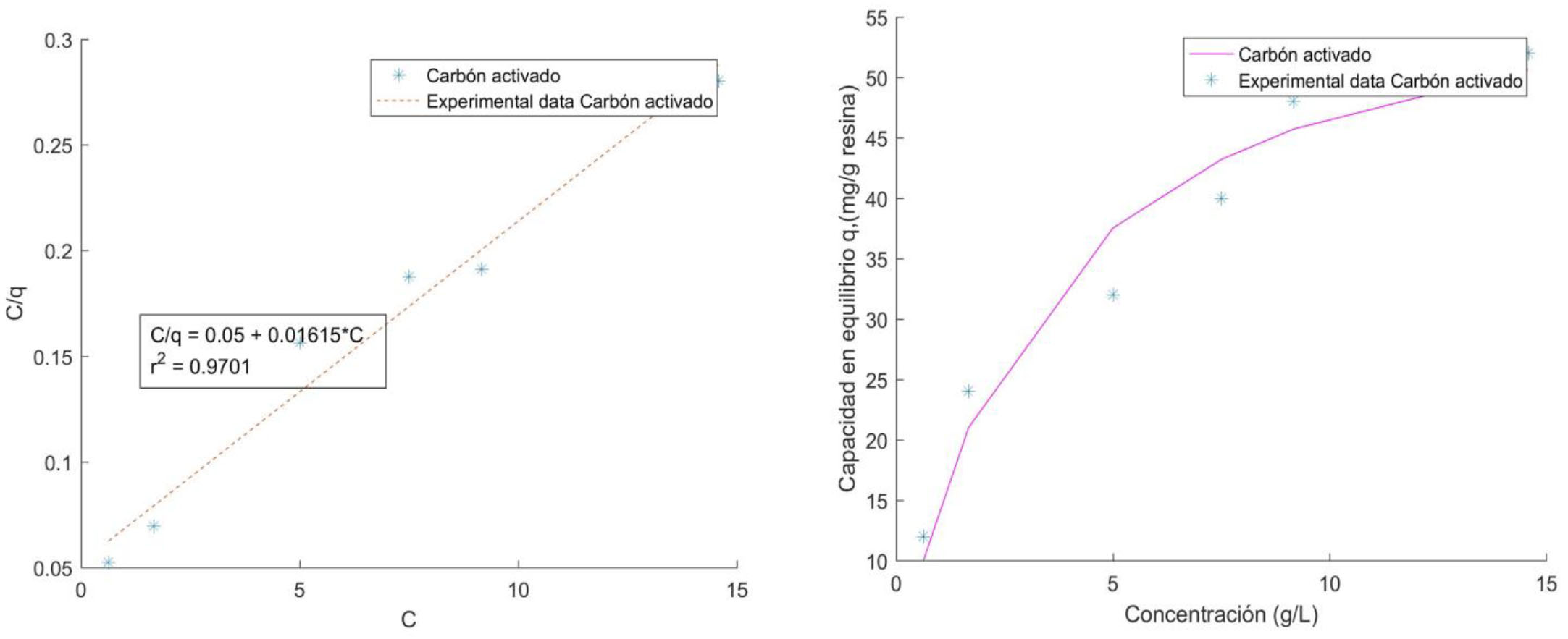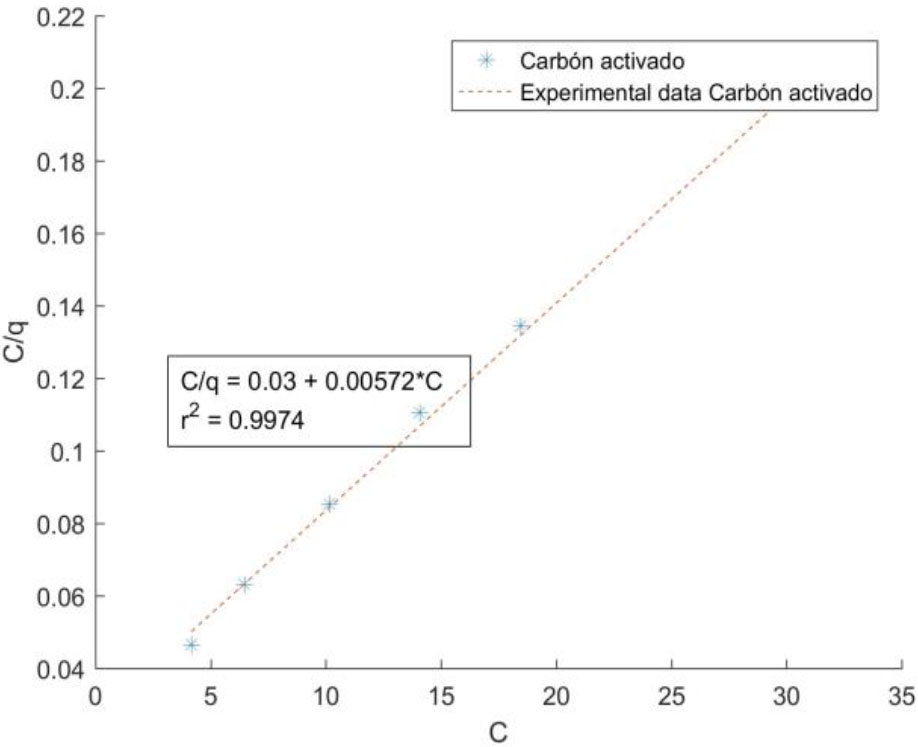 En realidad, las suposiciones anteriores no se han comprobado en su totalidad al utilizar carbón activado, debido a su morfología y distribuciones energéticas, sin embargo, las suposiciones 5 y 6 probablemente se compensen entre sí, ya que las interacciones adsorbato-adsorbato aumentan al aumentar la cobertura, al mismo tiempo que las entalpias de adsorción disminuyen al aumentar la cobertura (Marsh & Rodríguez-Reinoso, 2006), por otro lado, la ecuación de Langmuir ha sido ampliamente utilizada para describir la adsorción sobre carbón activado pues originalmente esta isoterma fue desarrollada para representar la adsorción de un sistema gas-sólido en donde el adsorbente sólido era carbón activado (Castellar, Angulo, Zambrano, & Charris, 2013).