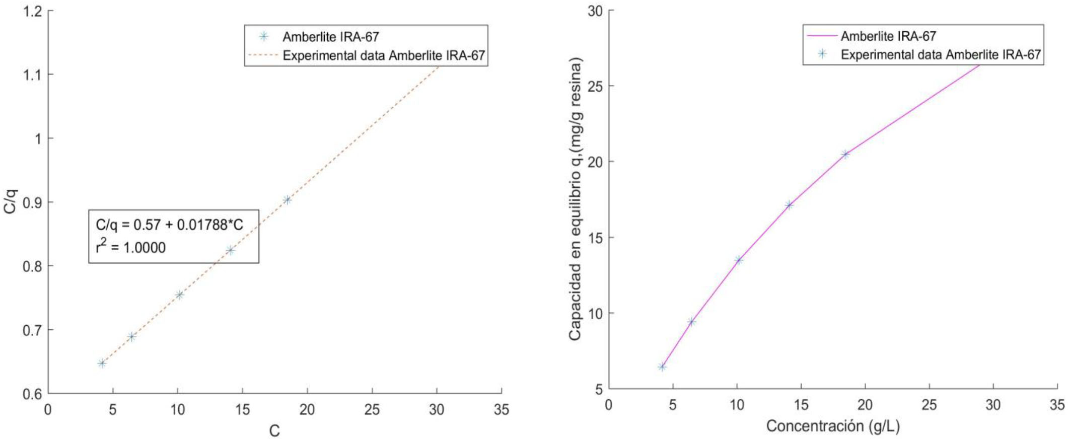 Se han realizado estudios para comparar la eficiencia de la adsorción de ácido láctico sobre resina Amberlite IRA-67 y carbón activado (Bayazit S.S., Inci I., Uslu H.,2011), las resinas actualmente se vienen utilizando gracias al excelente comportamiento en los procesos de adsorción, sin embargo, no existen muchos reportes sobre la utilización de estas resinas en ácidos carboxílicos. La isoterma de Langmuir permite encontrar la carga máxima (capacidad límite) del adsorbente que ocurre cuando la monocapa está completa, lo que proporciona la posibilidad de ver el comportamiento de cada uno de los adsorbentes y así predecir el adsorbente que se ajuste mejor a las condiciones deseadas, el cual será el que tenga una mejor capacidad de adsorción.