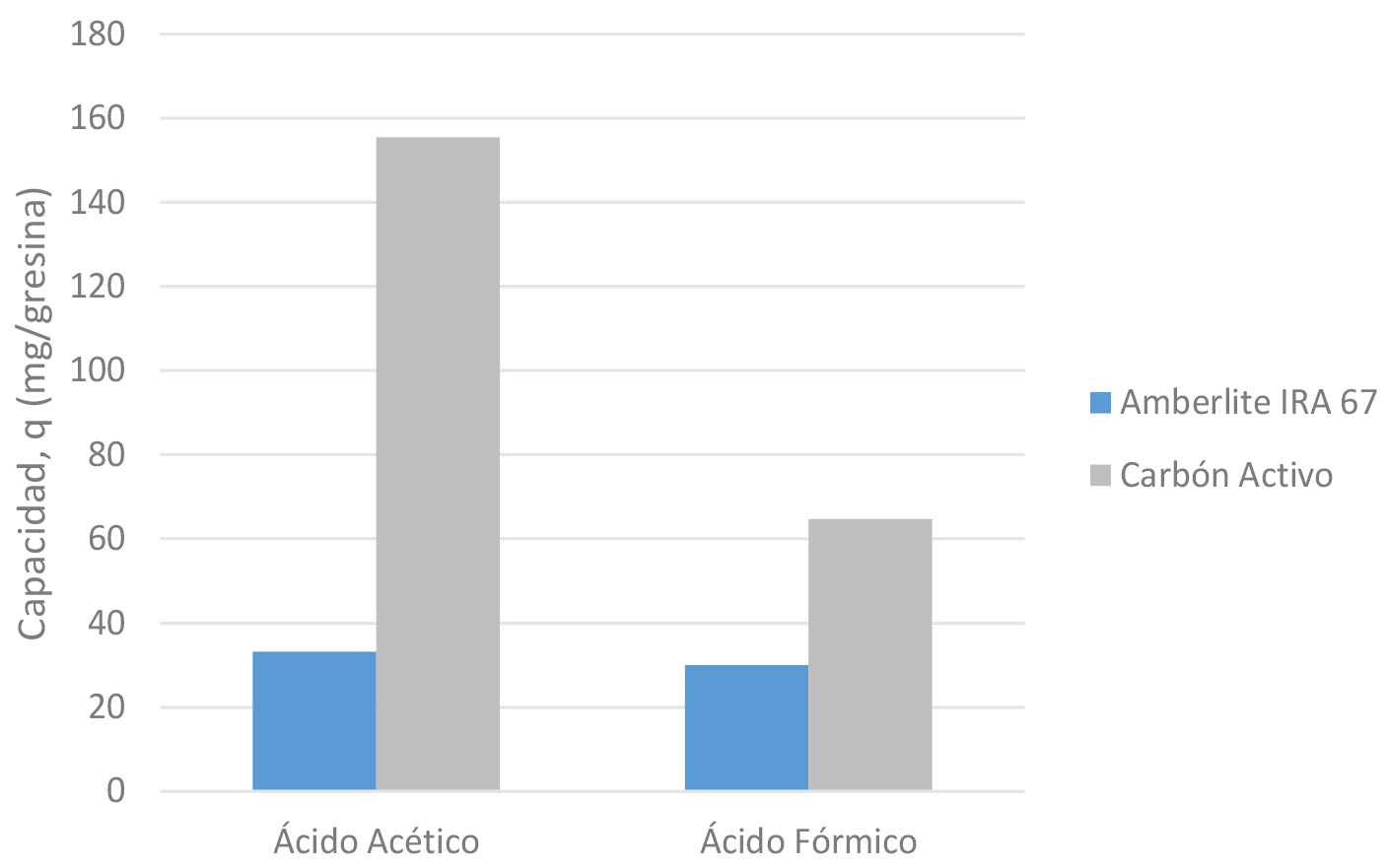 Tomando una concentración en el equilibrio de 37 g/L para los datos ajustados de cada ácido se puede observar en la figura 10 que, para el ácido acético y fórmico, el comportamiento sobresaliente para el proceso de adsorción se presenta con el adsorbente sólido carbón activado, pues supera en un 85% y 55% para los ácidos acético y fórmico, respectivamente, la capacidad de adsorción de la resina Amberlite IRA-67. Esto quiere decir que el carbón activado puede adsorber mayor cantidad de ácido acético y fórmico por masa de material, esto gracias a sus características físicas tales como el volumen especifico del poro y el área superficial, pues estas influyen directamente en el proceso de adsorción, es claro observar que para la resina Amberlite IRA-67 las capacidades de adsorción no cambian significativamente dependiendo del ácido adsorbido mientras que para el carbón activado la diferencia es notable, esto conduce a que la naturaleza del adsorbato produce cambios relevantes en la capacidad de adsorción, con lo cual se puede inferir que el carbón activado tiene una afinidad mayor con el ácido acético que con el ácido fórmico, mientras que para la Amberlite IRA-67 las afinidades son similares con los dos ácidos estudiados.