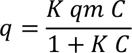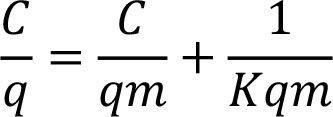 Donde k y qm denotan el coeficiente de equilibrio de la isoterma de Langmuir y la capacidad máxima de adsorción respectivamente. C es la concentración de ácido de la fase de solución en el equilibrio y q es la concentración de ácido de la fase sólida en el equilibrio. Los valores de k y qm pueden encontrarse a partir de datos experimentales usando una linealización de la ecuación (1), como sigue la ecuación (2), (Ho, 2004):