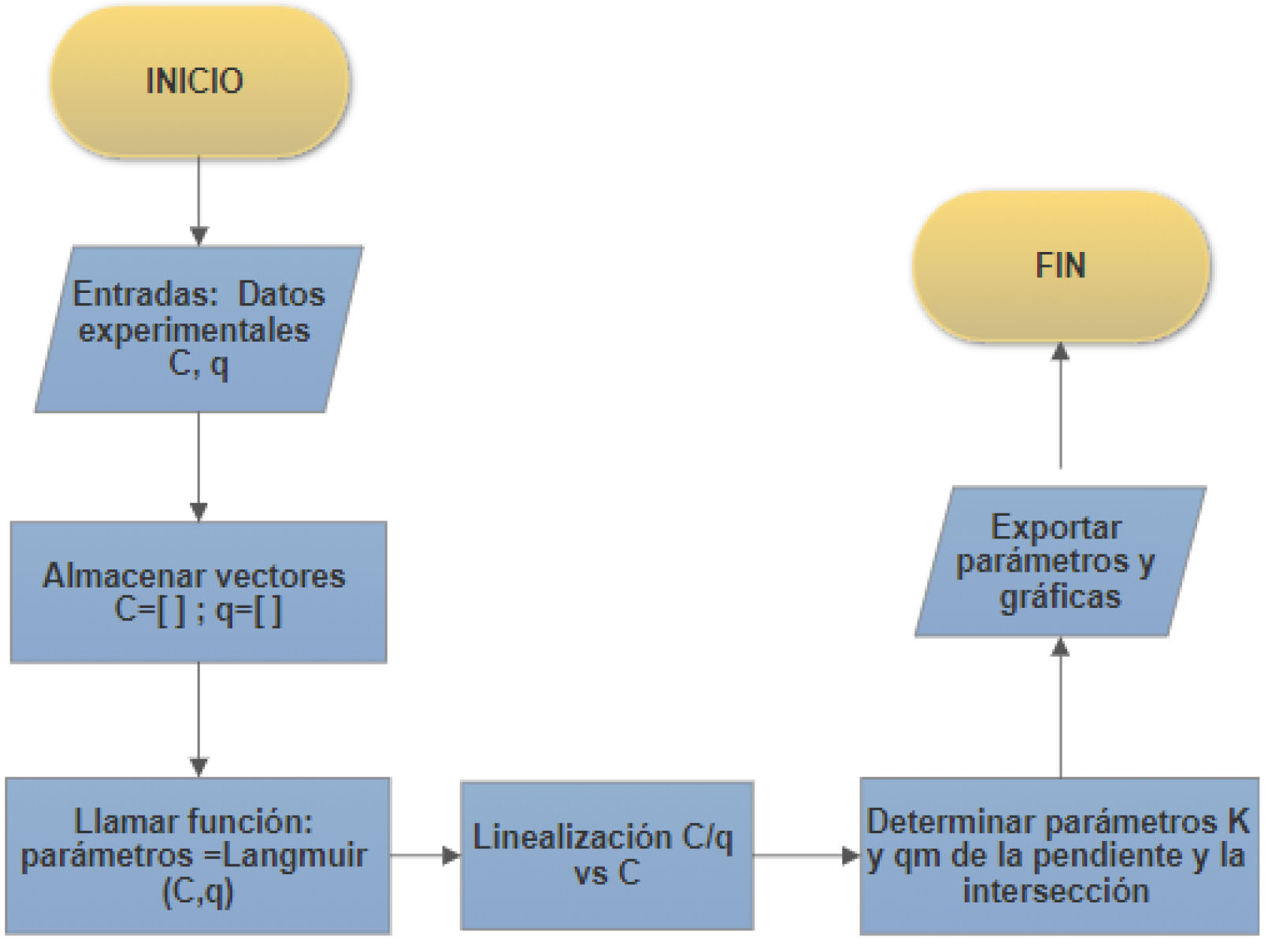 Se ajustaron los datos experimentales a la ecuación de Langmuir y a partir de ellos se obtuvieron los parámetros de esta ecuación ejecutando el algoritmo de la figura 1 en MATLAB R2012b, los datos experimentales fueron tomados de la literatura para cada ácido y cada adsorbente.