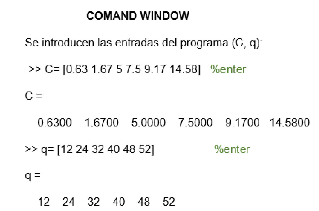 Figura 2. Almacenamiento de vectores (C,q) en la ventana de comando. Fuente: propia