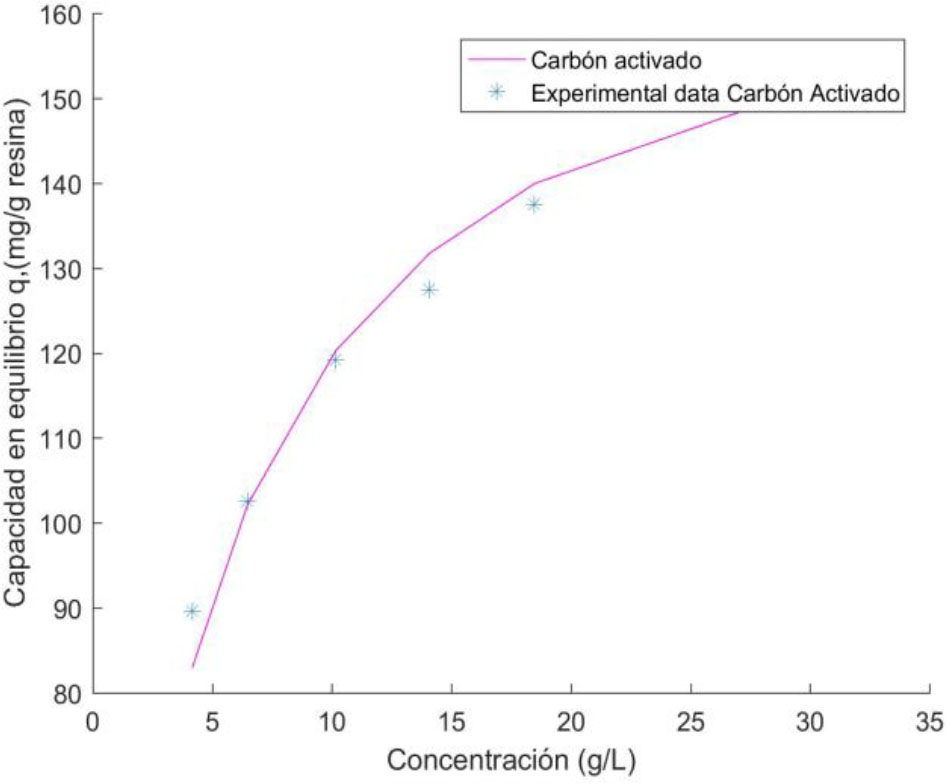 El algoritmo ejecutado en Matlab® proporciona los parámetros necesarios de la isoterma de Langmuir para realizar un análisis adecuado respecto a la capacidad de adsorción de cada adsorbente sólido cuando estos están en contacto con el ácido acético y fórmico. Después de analizar los datos experimentales y de ajustar dichos datos se puede observar que el adsorbente que proporciona un comportamiento destacado para remover estos ácidos cuando están en solución acuosa es el carbón activo, gracias a sus propiedades físicas.