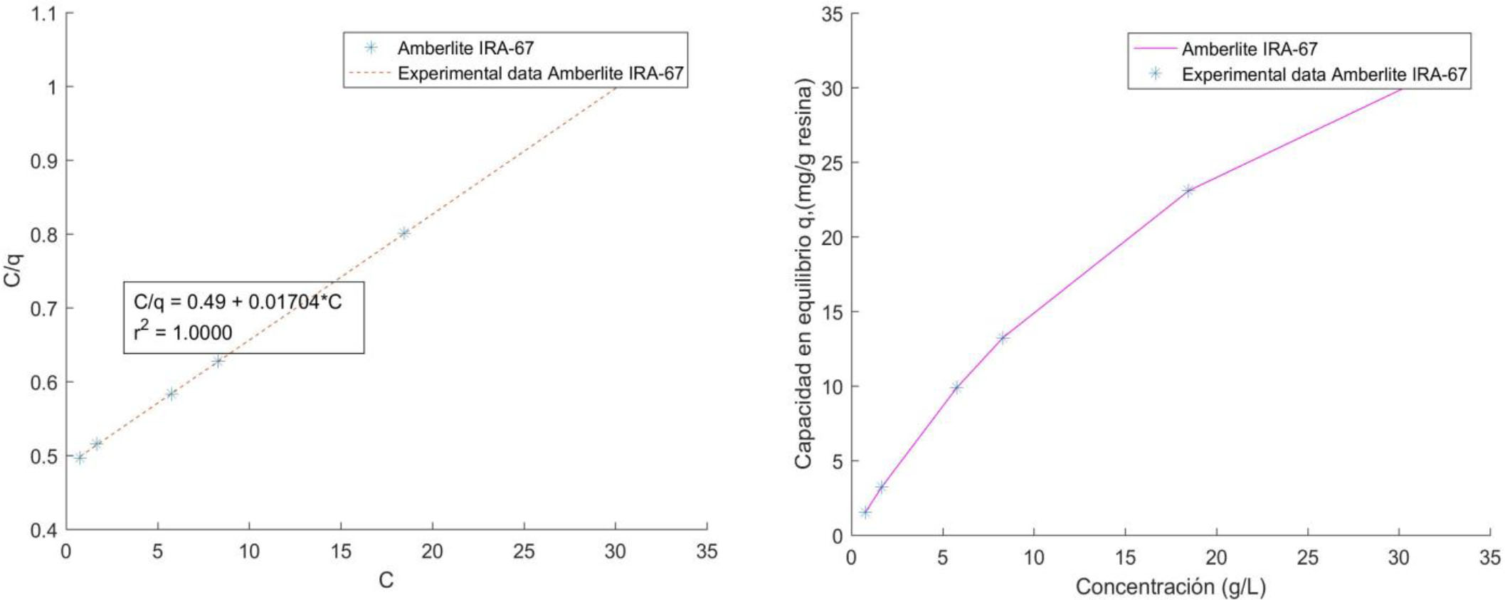 Se han realizado estudios para comparar la eficiencia de la adsorción de ácido láctico sobre resina Amberlite IRA-67 y carbón activado (Bayazit S.S., Inci I., Uslu H.,2011), las resinas actualmente se vienen utilizando gracias al excelente comportamiento en los procesos de adsorción, sin embargo, no existen muchos reportes sobre la utilización de estas resinas en ácidos carboxílicos. La isoterma de Langmuir permite encontrar la carga máxima (capacidad límite) del adsorbente que ocurre cuando la monocapa está completa, lo que proporciona la posibilidad de ver el comportamiento de cada uno de los adsorbentes y así predecir el adsorbente que se ajuste mejor a las condiciones deseadas, el cual será el que tenga una mejor capacidad de adsorción.