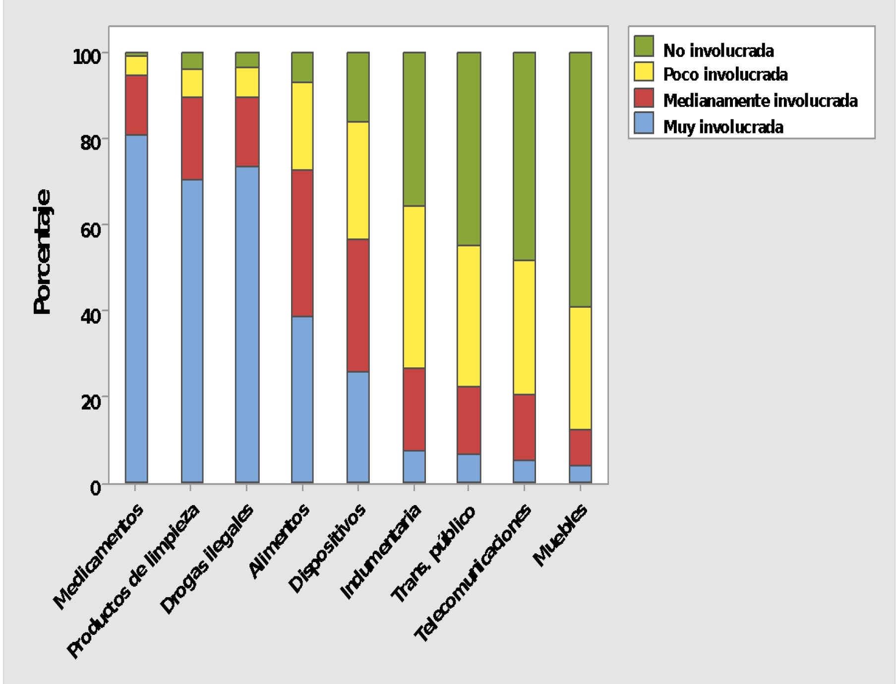 Respecto de la vinculación de la química en diferentes temáticas y actividades de fuerte relevancia social, se diseñaron dos preguntas que debían responderse usando una escala valorativa a 4 puntos: no involucrada, poco involucrada, medianamente involucrada y muy involucrada. En la primera pregunta se indagaba sobre el nivel de involucramiento de la química en los medicamentos, productos de limpieza, drogas ilegales, alimentos, indumentaria, dispositivos y aparatos tecnológicos, el transporte público, las telecomunicaciones y los muebles. Del análisis de los resultados se puede observar que hay una clara tendencia a considerar a la química muy involucrada en temas con los cuales se la relaciona socialmente, como son los medicamentos, los productos de limpieza y las drogas ilegales, donde más del 90% de los estudiantes consideraron que la Química está muy involucrada o medianamente involucrada con cada uno de ellos (ver Figura 2). Respecto de la indumentaria, el transporte público, las telecomunicaciones y los muebles, más del 70% de los estudiantes consideraron que la Química está poco involucrada o no involucrada con ellos, aunque reconocen en el marco de las entrevistas que están formados por materiales que lo vinculan directamente con la química pero no visualizan la química en su funcionamiento ni en su ensamblaje. Por último, en relación a los alimentos y los dispositivos/aparatos tecnológicos, la valoración de los estudiantes se muestra en una implicancia intermedia.