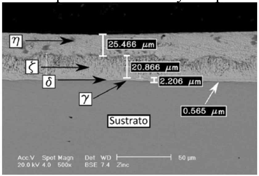 Figura 4. Imagen de microscopía electrónica de barrido de un revestimiento de Zn sobre acero al carbono AISI 1018, obtenido mediante galvanizado por inmersión en caliente, indicando las diversas zonas del recubrimiento. Electrones retrodispersados. 500 X. [7]