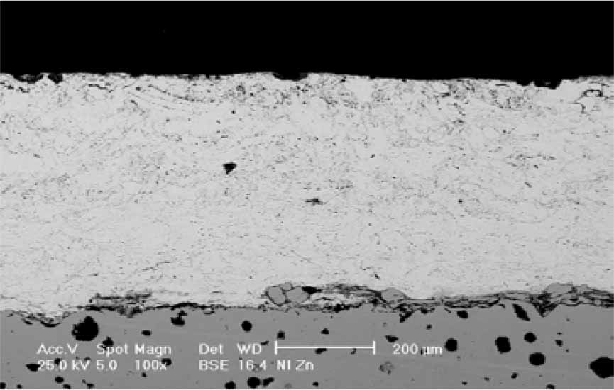 Figura 5. Imagen de microscopia electrónica de barrido de una capa de Zinc sobre fundición nodular, obtenida mediante proyección térmica por flama. Electrones retrodispersados. 100X