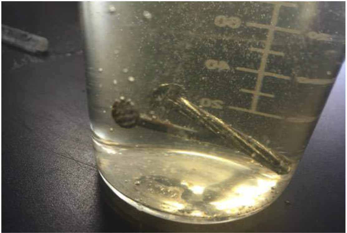 Figura 6. Clavo de acero al carbono unido a clavo galvanizado en presencia de un medio salino. El clavo con la capa rica en zinc, protege al clavo de acero. Ejemplo de un sistema de Protección Catódica