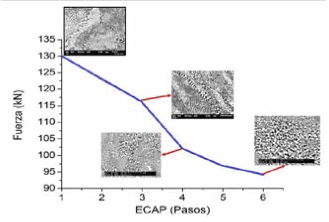 En la actualidad se pueden encontrar trabajos que estudian los procesos de deformación plástica severa para lograr el refinamiento de grano de las aleaciones, tales como la extrusión en canal angular constante (ECAP) [16]. En trabajos realizados con las aleaciones Zn-Al se ha logrado, mediante ECAP, un tamaño de grano menor a 1 µm [17, 18]. En la figura 10 se puede observar que la carga que se requiere para ECAP de la aleación Zn-Al con microestructura laminar, es mayor que la necesaria para deformar la aleación con microestructura de granos finos. Con este tamaño de grano podría ser viable que la aleación se pueda deformar superplásticamente, a temperatura ambiente, para fines didácticos.