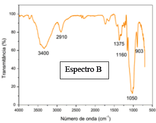 “Pode ser representada pelo espectro A, que apresenta uma banda longa por volta de 3000 cm-1, relacionada ao OH, e também uma banda na faixa dos 1800 cm-1, que representa C=0”.