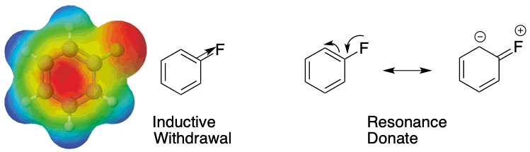 In the category of balanced effects, the most important example to show the students is fluorobenzene, for which the qualitative data (sp = -0.07, F = +0.45, R+ = -0.52) indicate almost equal qualitative data between the two effects. The fluoro group is expected to provide both a strong inductive withdrawal and a weak resonance donation (Figure 12) (Rosenthal & Schuster, 2003). Depending on the electrophile, fluorobenzene has approximately the same rate of reaction as benzene in SEAr (from 0.4-1.73 compared to rate = 1 for benzene) (Ault, 1966; Ault, 2004). It is perhaps preferable to consider fluorobenzene as neither activated nor deactivated but rather ‘similar to benzene’. The MEP (Figure 12) confirms the balanced effects.