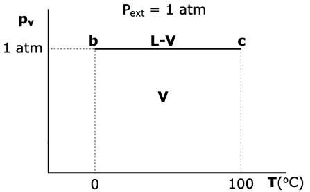A projection onto plane pv-T of the diagram of figure 1 is shown in figure 2. Such diagram allows concluding−in a redundant but more dramatic way−that for all temperatures (from point b to point c) total vapor pressure equals external pressure. As was suggested above, from 0 °C to 100 °C, saturated solutions of air in water in an open vessel are under boiling condition. In order to describe the system behavior, it is very useful to construct the projection of figure 1 on the T-x plane. Table 1 shows the values xwV,L vs. T (xw: water mole fraction; V: vapor, L: liquid), and Figure 3 is the corresponding qualitative representation.