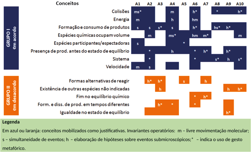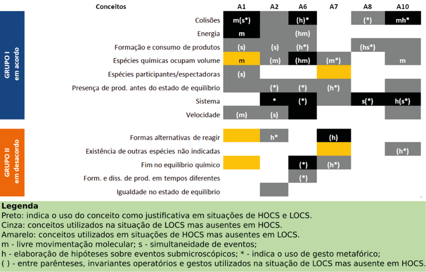 Em outras palavras, manifestar concepções alternativas não necessariamente estaria relacionado à ausência da elaboração submicroscópica. Além disso, os esquemas de ação em situações de baixa ordem cognitiva para o equilíbrio químico guardam em si um hibridismo entre conceitos aceitos e alternativos. Estes esquemas seriam caracterizados por relações conceituais parcialmente pertinentes onde formas alternativas de reagir ou a existência de espécies que não estariam indicadas na reação, por exemplo, surgiriam preferencialmente formuladas como hipóteses sobre eventos submicroscópicos. Os dados também sugerem que o invariante relativo à simultaneidade de eventos muito embora não seja exclusivo daqueles que não manifestaram conceitos do Grupo II, é um elemento desejável e importante para a resolução de tarefas que versam sobre o equilíbrio químico.