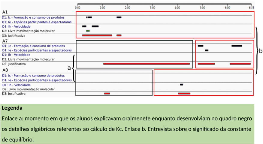 Considerando que o cálculo da constante de equilíbrio mobiliza predominantemente conceitos relativos às estruturas aditivas e multiplicativas no campo da álgebra esperar-se-ia, de fato, esquemas de ação pobres em conceitos químicos. No entanto, merece destaque os conteúdos conceituais presentes no enlace b - o ato de explicitar os significados químicos relacionados à constante de equilíbrio e ao valor numérico a ela associado, seria a oportunidade para acessar informações sobre o campo estrutural molecular[5]. Contudo, as explicações contemplaram a ideia de formação de reagentes e de produtos ou no máximo a definição cinética da constante de equilíbrio.