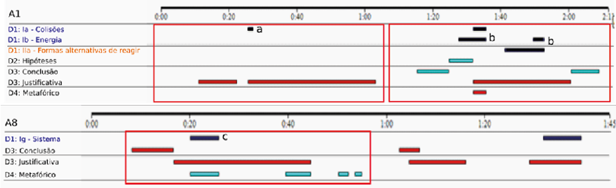 Os alunos A1 e A8 produziram justificativas conceitualmente pobres focalizando a não reatividade do argônio sem supor o modelo dos gases ideais e, por conseguinte, a ausência de interações intermoleculares. O efeito desestabilizador da interação com uma situação de alta ordem cognitiva também se fez presente: as hesitações ao tentar elaborar uma explicação pouco usual nos cursos de química geral predominaram nos turnos de falas.