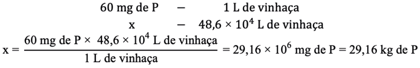 Em seguida, busca-se saber a quantidade aproximada de fósforo (P) disponível na vinhaça, sabendo que cada litro de vinhaça contêm 60 mg de P, sendo assim