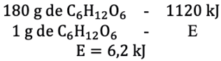 Identifica-se inicialmente a necessidade de determinar a massa molar da glicose (C6H12O6), uma vez que pela equação disposta na questão, 1 mol de glicose libera 2800 kJ de energia. Assim,