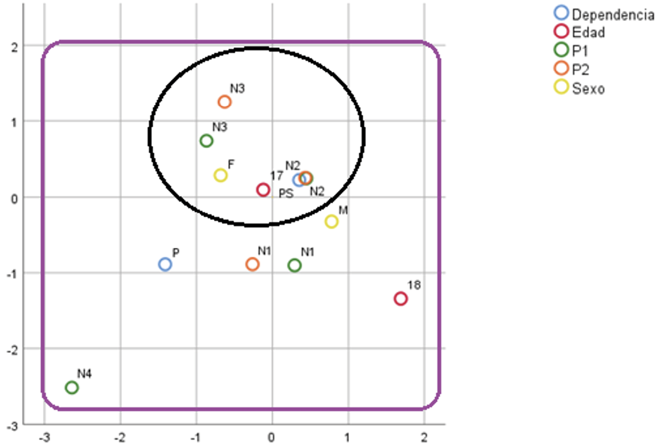 Considerando que las variables se correlacionan y recogen una cantidad suficiente de información para explicar el fenómeno bajo estudio, es posible representarlas a partir de las categorías propias de cada una (Sexo: M y F; Edad: 17 y 18; Dependencia: P y PS; P1 y P2 con niveles N1, N2, N3 y N4), particularmente las frecuencias por cada modalidad, obteniendo así la Figura 4. Al respecto es posible identificar dos perfiles que se aprecian a continuación.