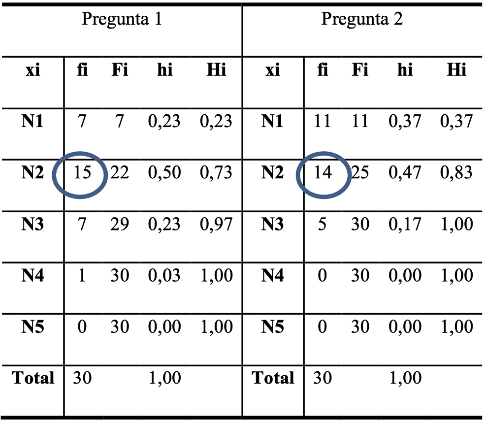 En base a la propuesta de Tamayo (2011) es posible evaluar y clasificar las 60 preguntas, para lo cual se construyó una tabla de frecuencia absoluta y relativa de cada nivel en cada pregunta del instrumento diagnóstico (Tabla 5).
