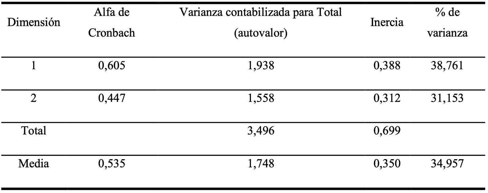 La Tabla 6, muestra un alfa de Cronbach para cada componente o dimensión de nivel medio (componente 2) o alto (componente 1), indicando que la correlación entre las variables es considerable. Así mismo, se encontró un porcentaje de varianza suficiente para estudios sociodemográficos, siendo de 38,76 para el componente 1 y 31,15 para el componente 2. Este por lo general suele ser del 25% según Abascal & Grande (1989).