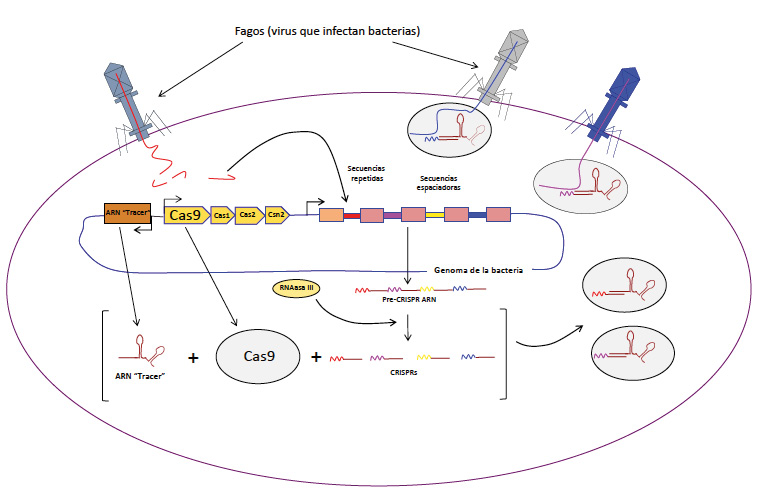 Figura 1. Sistema CRISPR/Cas9 de inmunidad adquirida en Streptococcus thermophilus. En general, diferentes fagos pueden infectar a esta bacteria, a los cuales la bacteria puede ser resistente activando su sistema CRISPR/Cas9. Las Cas9 más utilizada como herramienta es la de esta bacteria.