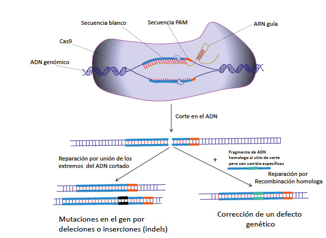 Figura 2. Mecanismos generales por medio del cual se pueden usar el sistema CRISPR/Cas9 para editar genomas. El corte por la Cas9 en un lugar específico del genoma hace que los mecanismos de reparación por daño a ADN entren en acción, y esto media los cambios deseados, ya sean diferentes tipos de mutaciones o la substitución de una región del genoma por otra diseñada por el investigador. Para detalles ver el texto.