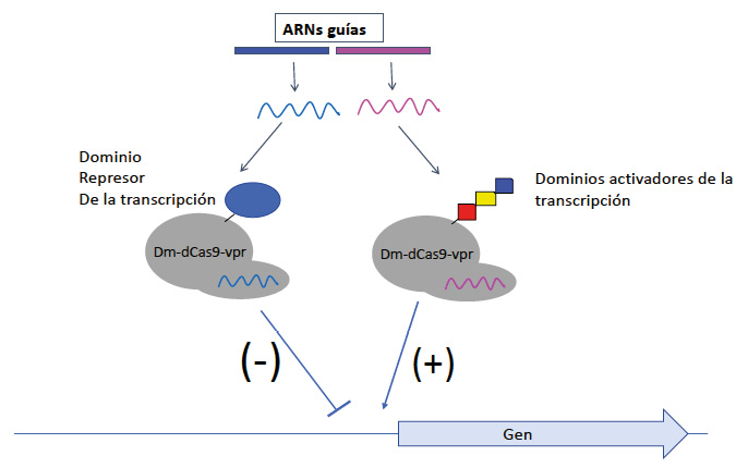 Figura 3. Utilización del sistema CRISPR/Cas9 para modular la expresión de un gen. Una Cas9 que no corta al ADN, pero que se puede dirigir a cualquier sitio en el genoma usando los ARN guías adecuados, puede llevar dominios que pueden activar la transcripción de un gen o dominios que repriman su expresión.