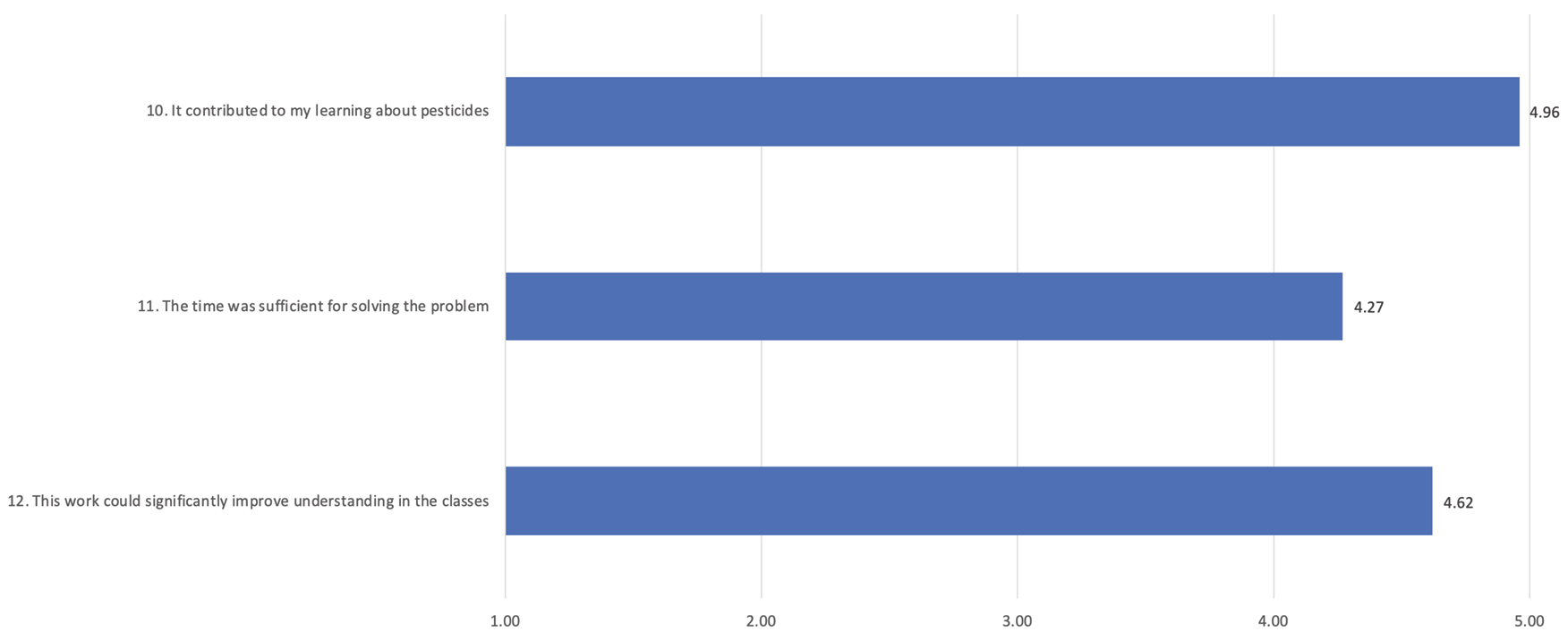 Figure 4 shows the opinions of the students concerning working according to the problem-solving methodology. The students agreed that the technique contributed to their learning about the topic of pesticides and the environment. In addition, they considered that the time allowed was sufficient for solving the problems and that the methodology favoured learning and could significantly assist their understanding.