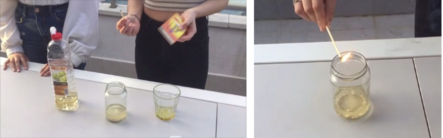 Esto es debido a que, en la reacción entre el vinagre y la tiza, se desprende dióxido de carbono, que es más denso que el oxígeno y desplaza a este fuera del bote. Al introducir la cerilla, esta se apaga por la falta de oxígeno gaseoso, necesario para la combustión. Se puede observar en la figura 1. Las alumnas compartieron la AES a través de la grabación de un video.
