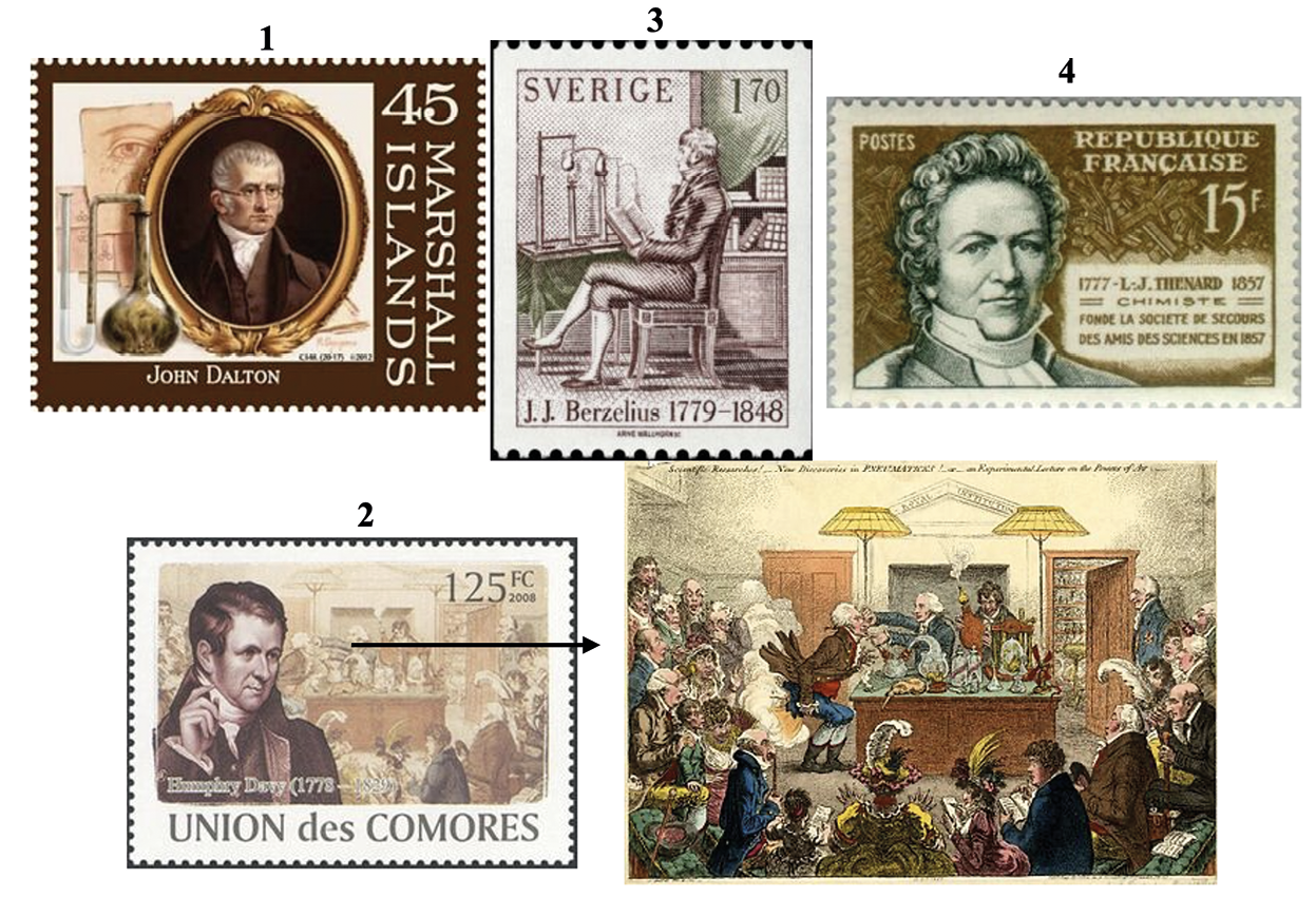 En la Figura 1 se resume la filatelia dedicada a Dalton, Davy, Thénard y Berzelius: el sello 1 (Islas Marshall, 2012) conmemora a Dalton y sus aportes a la química, el sello 2 (Unión de las Comoras, 2009) representa a Davy y conecta con un dibujo satírico de 1802 (imagen de dominio público), obra de James Gillray (1757-1817), mostrando una conferencia sobre neumática, se representan a Davy y el conde Rumford; el sello 3 (Suecia, 1979) representa a Berzelius en el II centenario de su nacimiento y el sello 4 (Francia, 1957), que conmemora el I centenario de la muerte de Thénard, que también descubrió el agua oxigenada; de acuerdo con Garritz (2009), Thénard en su Traité de chimie élémentaire (de 1810) y desde su propuesta de enseñanza de la química “insiste en el principio de proceder de lo simple a lo complejo, de lo sabido a lo desconocido, como una guía pedagógica conveniente” (p.295).