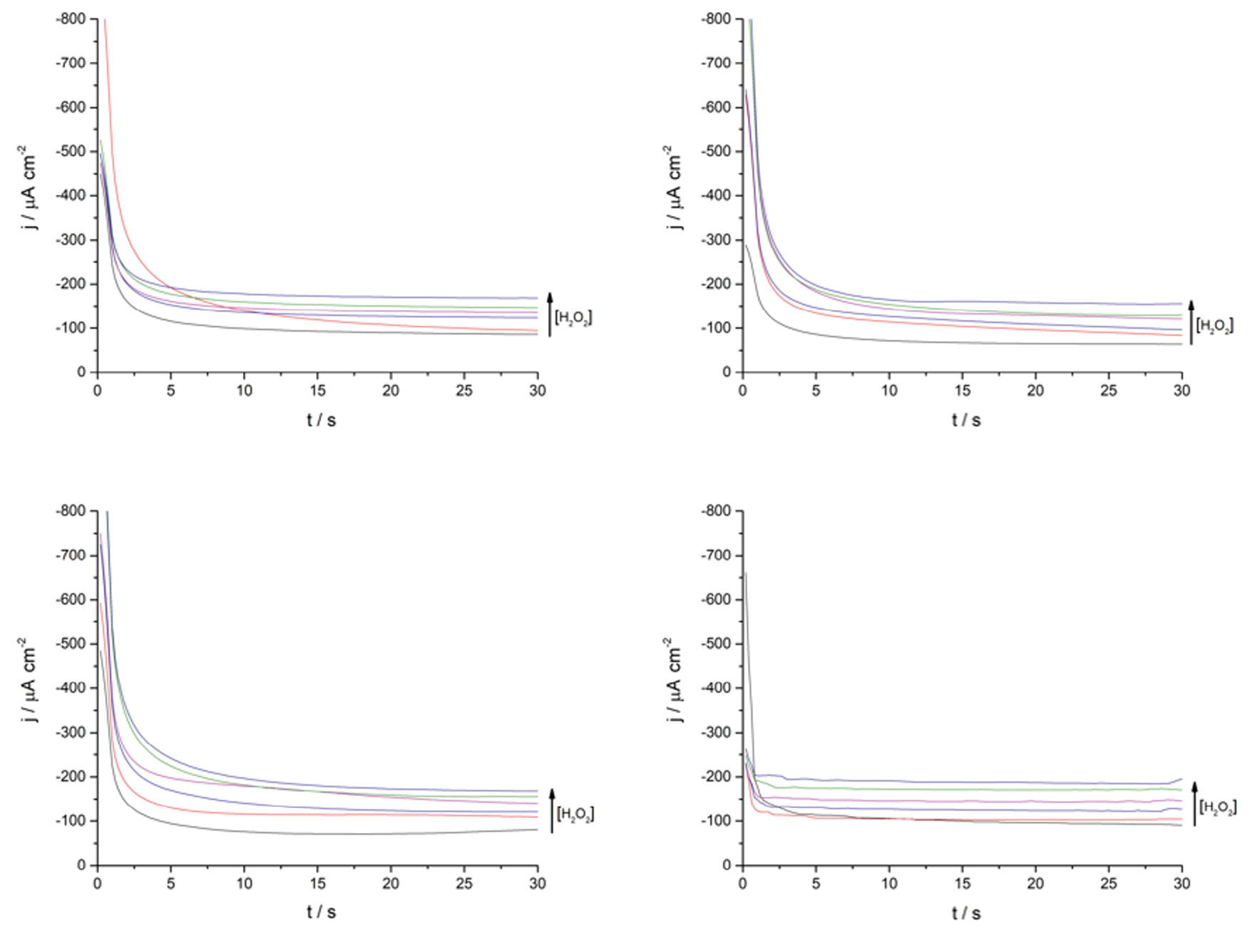 As shown in Figure 4 chronoamperometric results show a typical transient response profile to an applied potential step, with the particularity that rather than the current falling off to zero as predicted by the Cottrell equation, measured current fluctuates around a steady current value. This could indicate either slow WE kinetics or a well-mixed bulk solution that preserves a constant concentration of electroactive species. Students can perform an extensive data analysis from the chronoamperometric curves testing the validity of the Cottrell equation and if so, obtain parameters such as H2O2 D0 and compare it against reported values (Tjell and Almdal 2018).