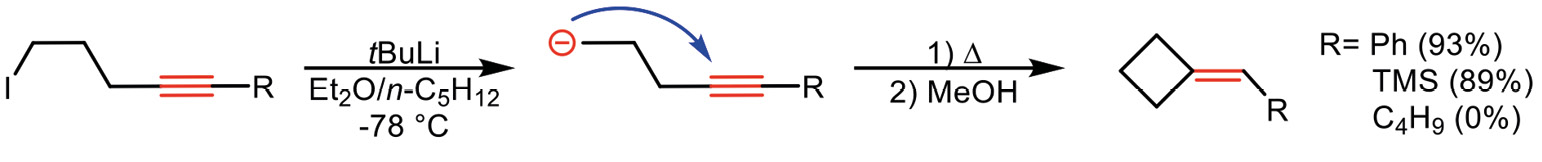 En la década de los 90’s, el grupo de Bailey dio a conocer las ciclaciones 4 y 5-exo-dig de carbaniones, donde la estabilización termodinámica es uno de los parámetros importantes para que se pueda llevar a cabo el cierre. Se observó que los alquinos que no contenían sustituyentes estabilizadores de aniones no son reactivos, en este caso no se encontró endo ni exociclación. Mientras que los sustratos que estaban sustituidos con fenilo (Ph) y tetrametilsilano (TMS) proporcionaron el producto 4-exo-dig (Esquema 4) (Gilmore et al., 2016).