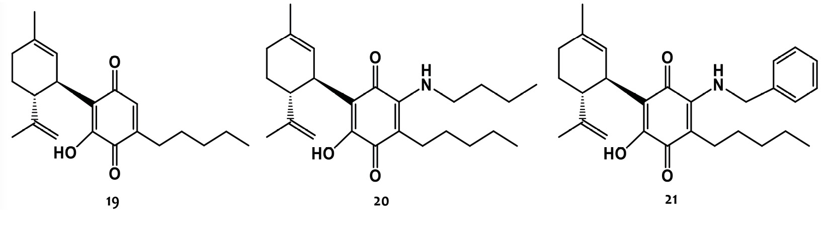 Otros derivados relevantes obtenidos por la modificación del núcleo resorcinol, fueron las quinonas. La primera hidroquinona de (-)-CBD, (19), (Figura 6), fue reportada en el año 1968 por Mechoulam y col. (1968) quienes la obtuvieron, en bajos rendimientos, mediante la oxidación aeróbica del (-)-CBD. Sin embargo, en el año 2004, el rendimiento de obtención fue mejorado a través de un ajuste de temperatura de la reacción (Kogan, 2004). En lo que respecta a su bioactividad, se demostró que 19 posee una elevada potencia para reducir el crecimiento de células HT-29 de carcinoma de colon humano, aunque el mecanismo de acción es independiente de los receptores cannabinoides CB1 y CB2 (Kogan, 2004). Asimismo, estos autores describen la importancia del grupo quinona para la actividad antiproliferativa contra diversas líneas celulares de cáncer. Otro de los efectos biológicos atribuidos a este compuesto, es la inhibición de la enzima citocromo P450 (Bornheim, 1998).