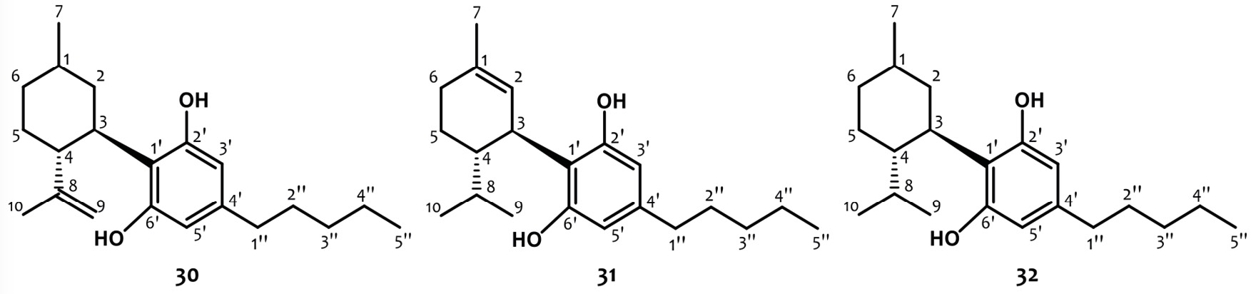Los derivados de CBD en los cuales se ha modificado el núcleo de limoneno y cuya actividad biológica está reportada, no son muchos, pero dentro de ellos, los más conocidos son los productos de hidrogenación (Ben-Shabat, 2006). La hidrogenación leve de (-)-CBD con PtO2 catalítico resultó en una mezcla de (-)-1,2-H2-CBD (30) y (-)-8,9-H2-CBD (31), mientras que la hidrogenación en condiciones más drásticas dio lugar al (-)-H4-CBD (32), el cual posee ambos carbonos, C-1 y C-8, hidrogenados (Figura 9) (Li, 2020; Ben-Shabat, 2006). Todos ellos, mostraron una gran capacidad antiinflamatoria mediante la inhibición de intermediarios reactivos de oxígeno tales como óxido nítrico. A diferencia del CBD, los derivados hidrogenados poseen afinidad por el CB1. Mientras que 31 demostró un efecto anticonvulsivo comparable al del CBD (Mascal, 2019).
