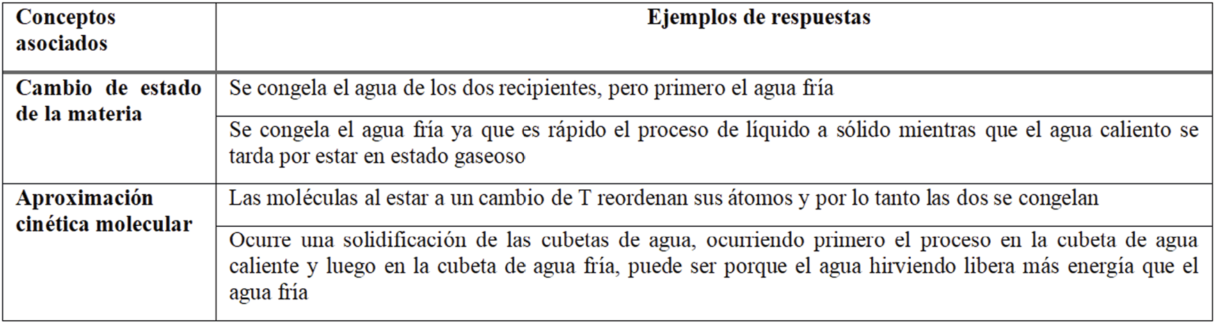 En esta pregunta los estudiantes ofrecen respuestas desde el sentido común, pues lo habitual es considerar que el agua fría se congela más rápido y fueron articuladas como cambio de estado en 23 estudiantes. Esta respuesta se asocia con el cambio de estado. En un segundo concepto, la respuesta se asocia a una aproximación cinética molecular, donde se involucran términos como reordenación de moléculas y liberación de energía.