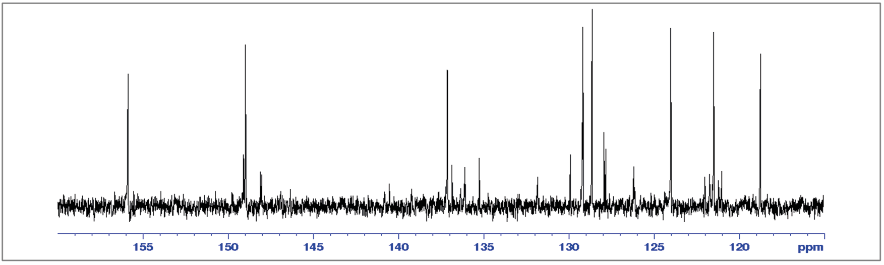 En el espectro IR para 8 se logran apreciar diferentes señales de gran importancia para su caracterización, tales como la banda a 3051.88 cm-1 que se interpreta como la Elongación generada por el enlace C-H del anillo bencénico y también de las piridinas, el cual adicionalmente desde 2000.00 hasta 1700.00 cm-1 genera una señal menos intensa atribuida a los Sobretonos de dicho anillo. En la zona de 1600.75 a 1550.05 cm-1, se encuentran las bandas debidas a las Elongaciones C=C tanto del anillo bencénico como del anillo piridínico mientras que a 1467.17 cm-1 hay una señal de intensidad media que es asignada a la Elongación C=N de los anillos de piridina. Estos mismos anillos, generan una señal de alta intensidad a 1392.42 cm-1 debida a la Elongación del enlace C-H de sus esqueletos. Finalmente, a 761.48 cm-1 se encuentra una señal también intensa que se corresponde con la Flexión C-H del anillo bencénico.