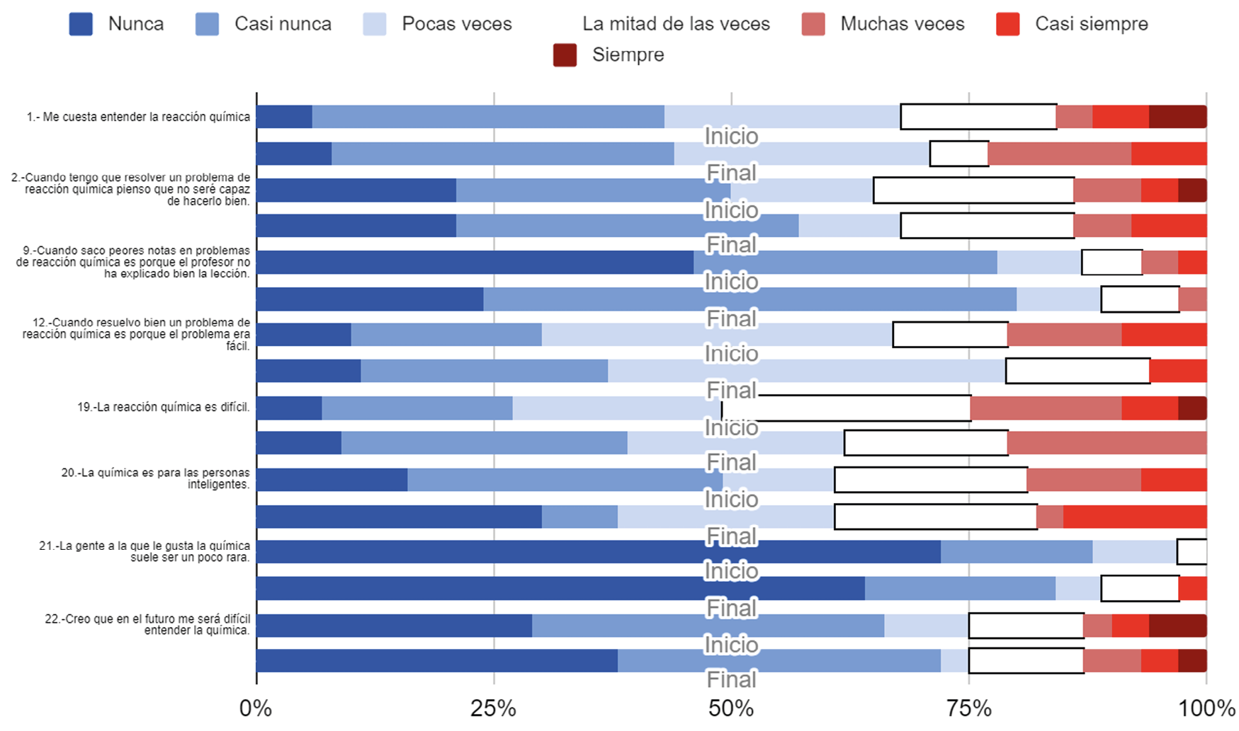 Los resultados presentados en la Figura 2 muestran un aumento en el porcentaje de estudiantes que eligen “siempre” y “casi siempre”, es decir, el comportamiento deseado. Un ejemplo claro es el enunciado: “Para mi futuro, la asignatura de química es una de las más importantes que tengo que estudiar”. Este resultado se relaciona con el enfoque de la SEA, que permitió al estudiantado construir una noción del sistema en equilibrio dinámico a partir del análisis de un hecho significativo y cotidiano: la caries dental. Así, se fortaleció la conexión entre el equilibrio químico y su aplicación en problemas de interés personal (Hellgren y Lindberg, 2017).