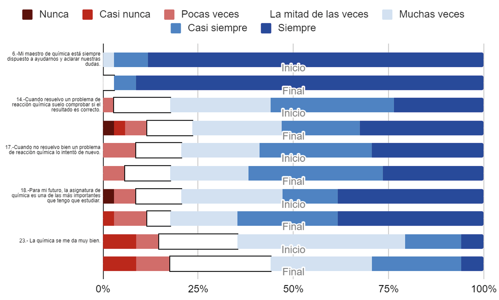 El único reactivo que muestra una disminución (10 %) tras la implementación de la SEA es el 23: “La química se me da muy bien”. Esto puede deberse a que, al incorporar un contexto, un estudiante que solía responder de forma memorística se ve obligado a aplicar lo aprendido, lo que revela posibles lagunas de comprensión. Esto es consistente con lo planteado por Parga-Lozano y Piñeros-Carranza (2018), quienes señalan que una enseñanza centrada en contenidos atomizados y descontextualizados favorece una comprensión mínima. En este sentido, el paso de una docencia tradicional a una contextualizada puede representar un cambio disruptivo que afecte temporalmente la autovaloración.