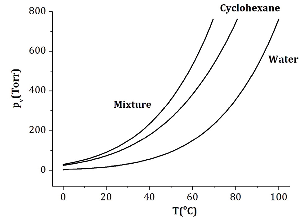 Finally, the vapor pressure of a mixture of water and cyclohexane is calculated (equation 1) as:
