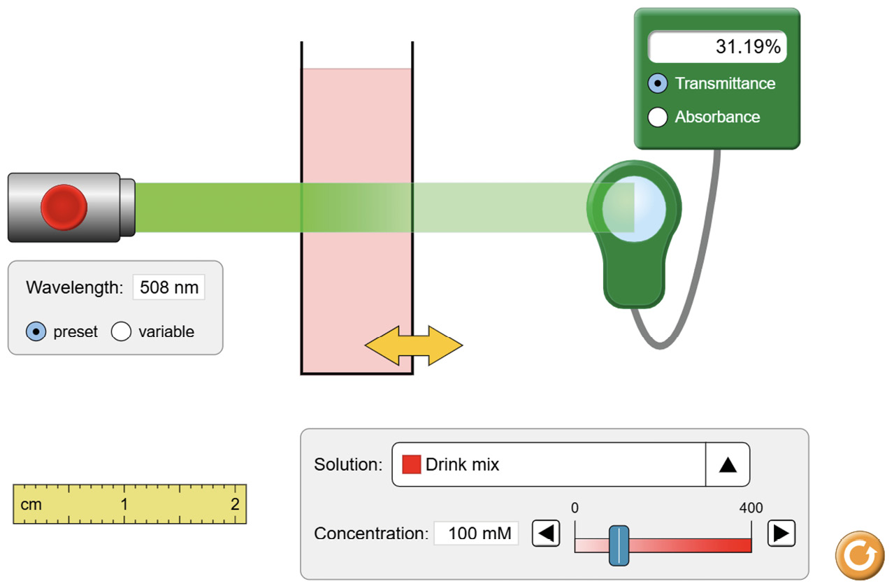 Ingrese a la simulación multimedia Beer’s Law Lab: Seleccione Concentración [mención de concepto - conceptual] y explore las diversas funciones de esta simulación. 1. ¿Puede el tipo de catión presente en una solución afectar su color? ¿Y el anión? Justifique su respuesta con evidencias [solicita una justificación - epistémico]. |