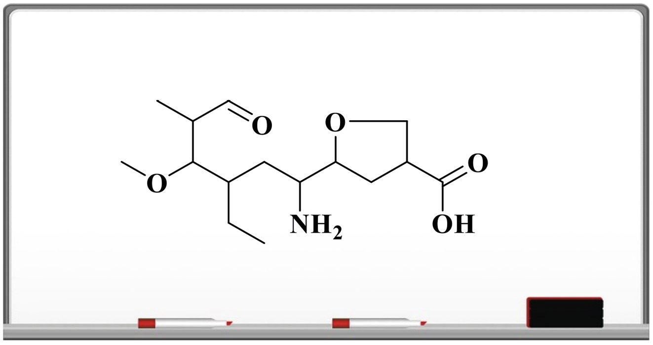 Pizarrón 1. Estructura ejemplo para darle su nombre IUPAC: ácido 5-(1-amino-3-etil-4-metoxi-5-metil-6-oxohexil)tetrahidrofuran-3-carboxílico).