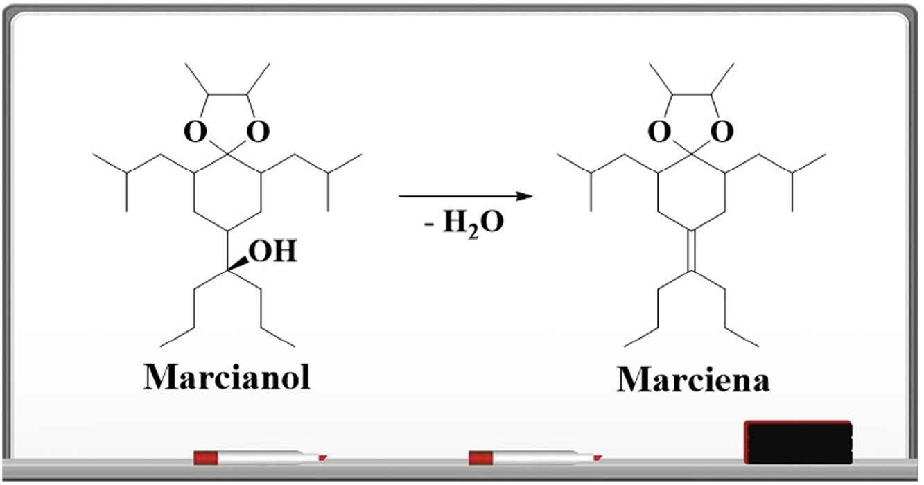 En el planeta de los marcianos, a partir del marcianol se hizo la marciena. El Dios de ellos vio que el marcianol estaba muy triste, que no tenía compañeros, que no tenía estereoisómero por ser simétrico, que vivía solito, y dijo: hagámosle una compañera al marcianol. Agarró Dios su libro de texto de Química Orgánica y encontró que, si se deshidrata el alcohol terciario con una metodología que no afecte al cetal, le debería de dar la olefina de Záitsev, y ya quedó la compañera del marcianol. Y en efecto, si el marcianol se deshidrata va a quedar el enlace doble de la marciena (Pizarrón 3) en el lugar adecuado predicho por la teoría y tan tan.