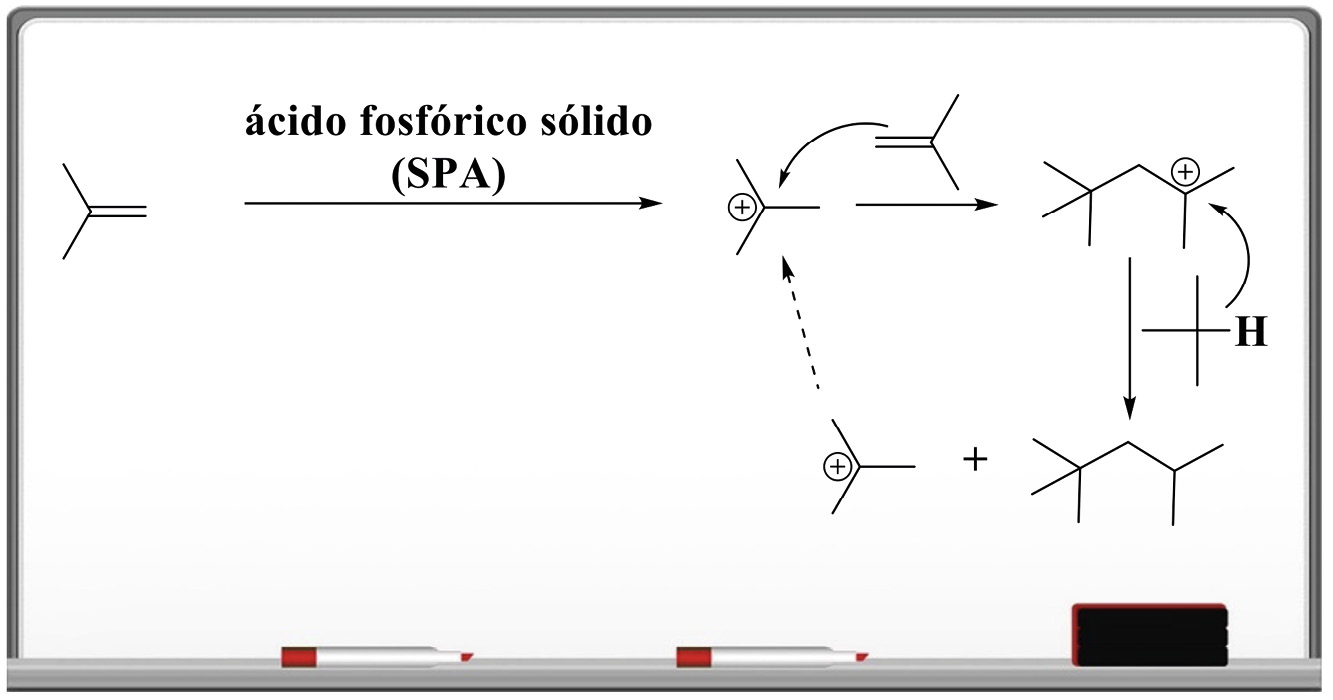 Un hombre que se ha olvidado se llamaba Vladimir Nikolayevich Ipatieff (1867-1952) (Grosse, 1937), un químico ruso que emigró a los Estados Unidos de América. Ipatieff descubrió que el isobuteno al hacerlo reaccionar con ácido fosfórico sólido, conocido como el catalizador SPA (por sus siglas en inglés) y elaborado mediante el tratamiento de sílice con ácido fosfórico, se protona para dar el carbocatión terciario que es atacado por otra molécula de isobuteno y el producto pierde un protón para dar una mezcla de alquenos, los cuales se hidrogenan y se obtiene el isooctano, que en una escala hecha por el hombre se le dio el índice de octano de 100 (Pizarrón 13) (Ipatieff y Komarewsky, 1937).
