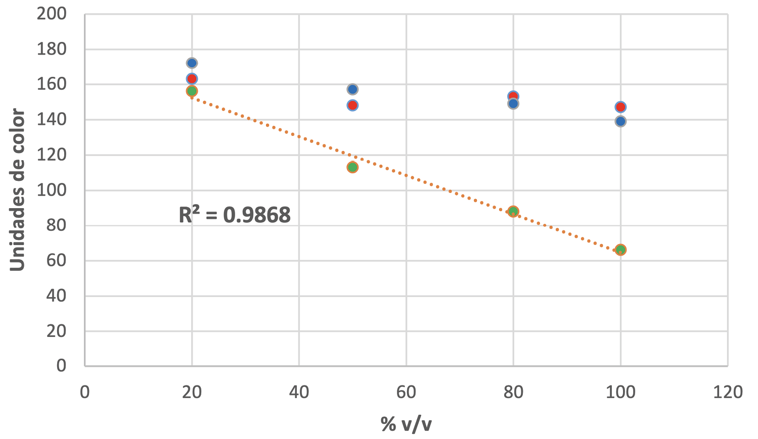 Figura A II-4. Variación de los parámetros de color R (rojo), G (verde) y B (azul) en función de la concentración, medidos con la aplicación Carolina® RGB Colorimeter, para el extracto acético al 4 % v/v. Se observa un ajuste lineal para el parámetro G.