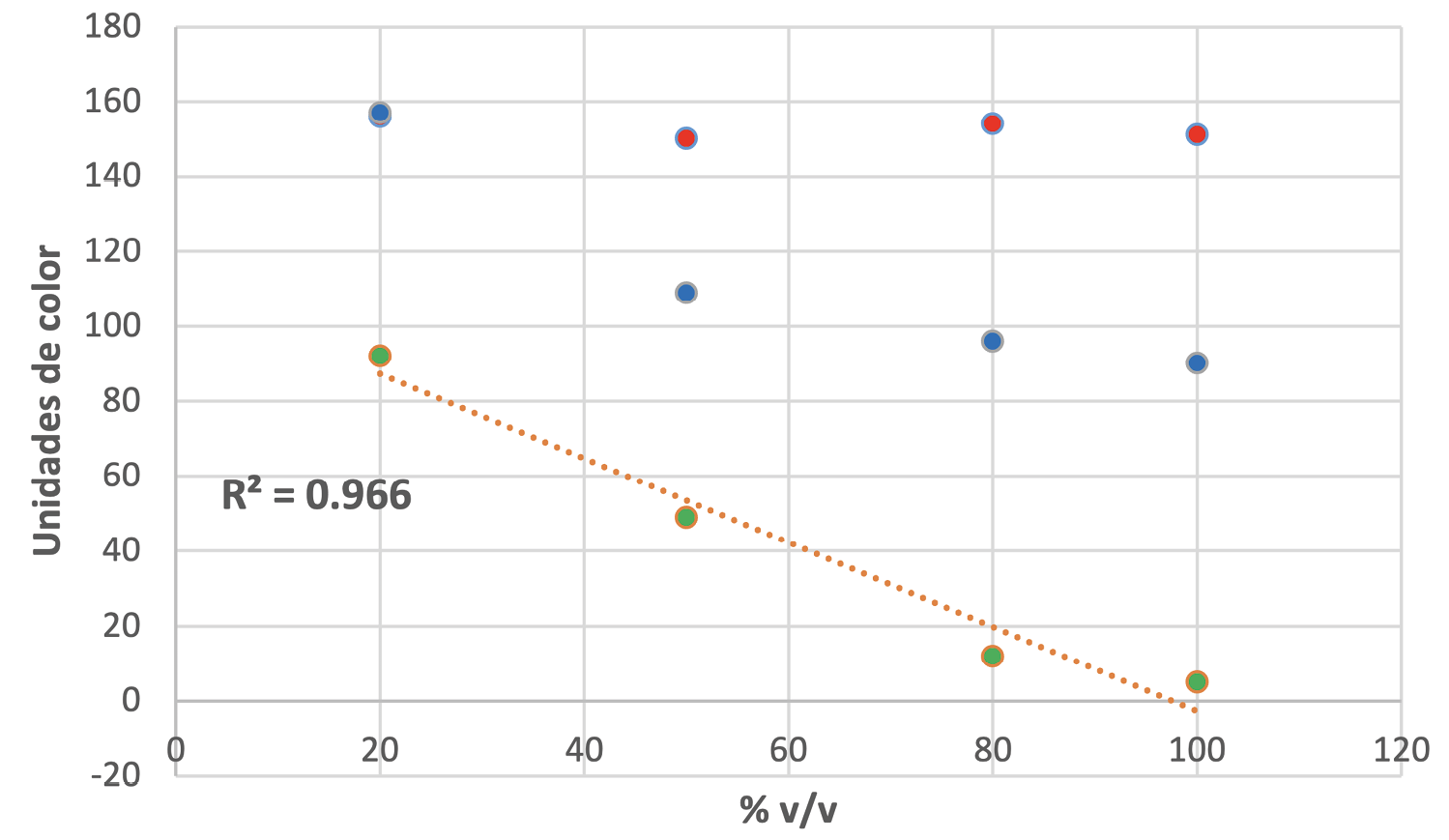 En las Figuras A II-3 y A II-4 se grafican los valores de los parámetros R, G y B según las diluciones estudiadas, evidenciando una dependencia lineal decreciente del parámetro G a medida que aumenta la concentración del extracto en los disolventes analizados.