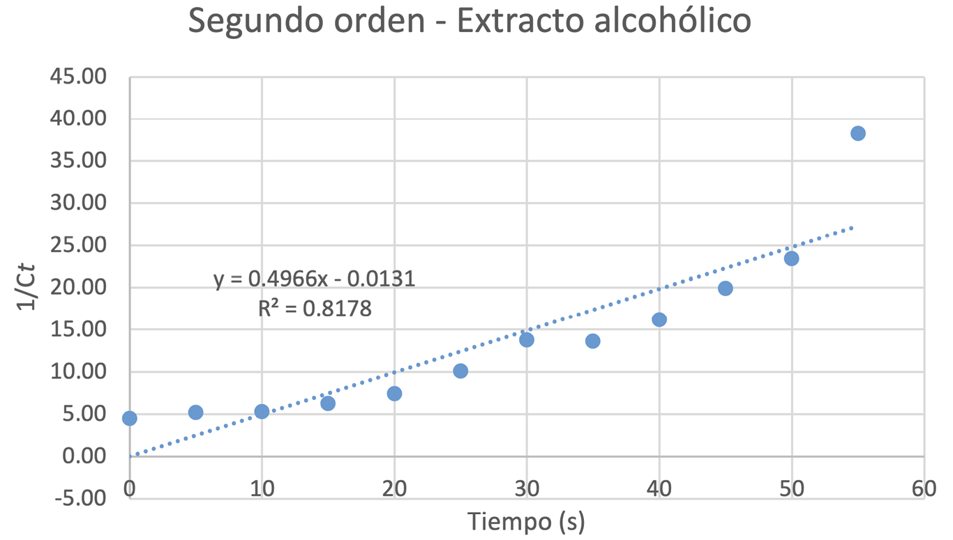 Los valores de kobs obtenidos fueron de –2,4 × 10⁻³ mol/(L·s) para el extracto acético y –3,74 × 10⁻² s⁻¹ para el extracto isopropílico. Las curvas derivadas de los datos experimentales del parámetro G para los distintos órdenes de reacción pueden consultarse en el Anexo III. A pesar de los altos valores del coeficiente de determinación (R²) en las curvas que mejor ajustan el comportamiento de cada extracto, los resultados sugieren mecanismos de reacción complejos y distintos entre sí.