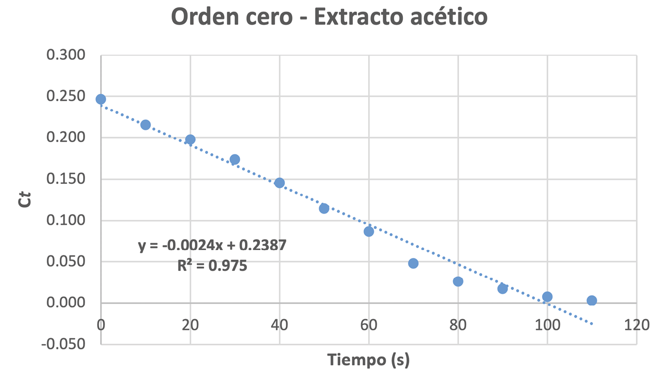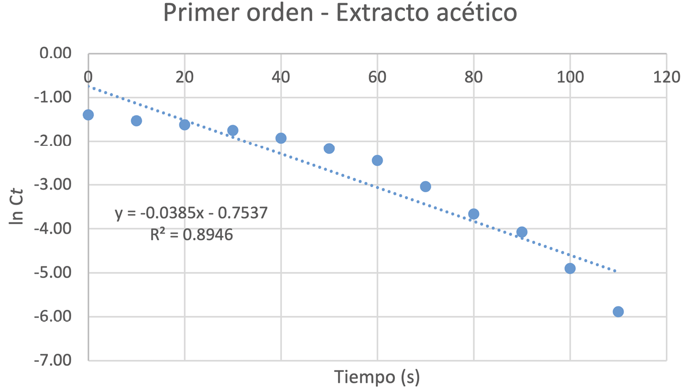 Se observó que, para los tiempos de reacción estudiados, la decoloración era rápida en ambos extractos. Hasta los 80 s, la gráfica Ct vs. t del extracto acético mostraba un comportamiento lineal, alejándose ligeramente de la tendencia en los últimos puntos. En cambio, la gráfica ln(Ct) vs. t del extracto isopropílico evidenció una tendencia lineal más persistente.