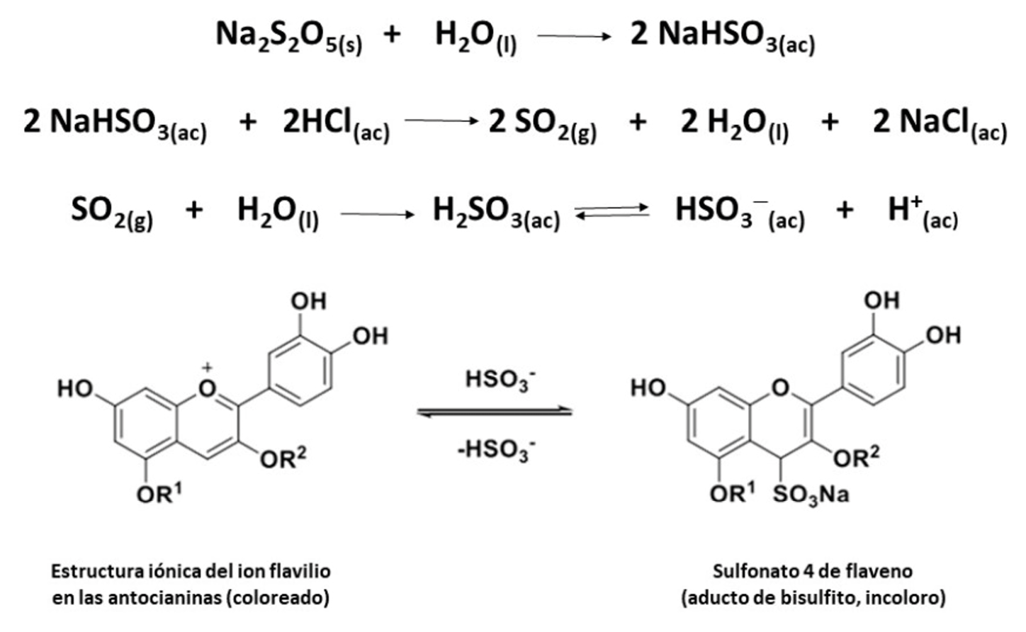 Figura 3. Secuencia de reacciones involucradas en la decoloración de extractos acuosos de antocianinas en presencia de metabisulfito de sodio.