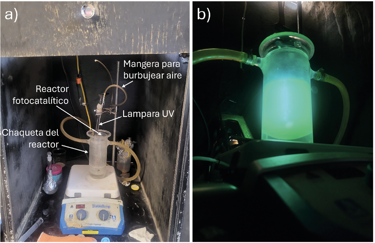 Una vez tomada la muestra inicial, la disolución con el catalizador se expone a una lámpara UV (Pen-Ray, 254 nm), con burbujeo de aire y agitación constante. El burbujeo se emplea para mantener oxígeno disuelto en el medio de reacción, ya que esta especie interviene en la degradación del contaminante.