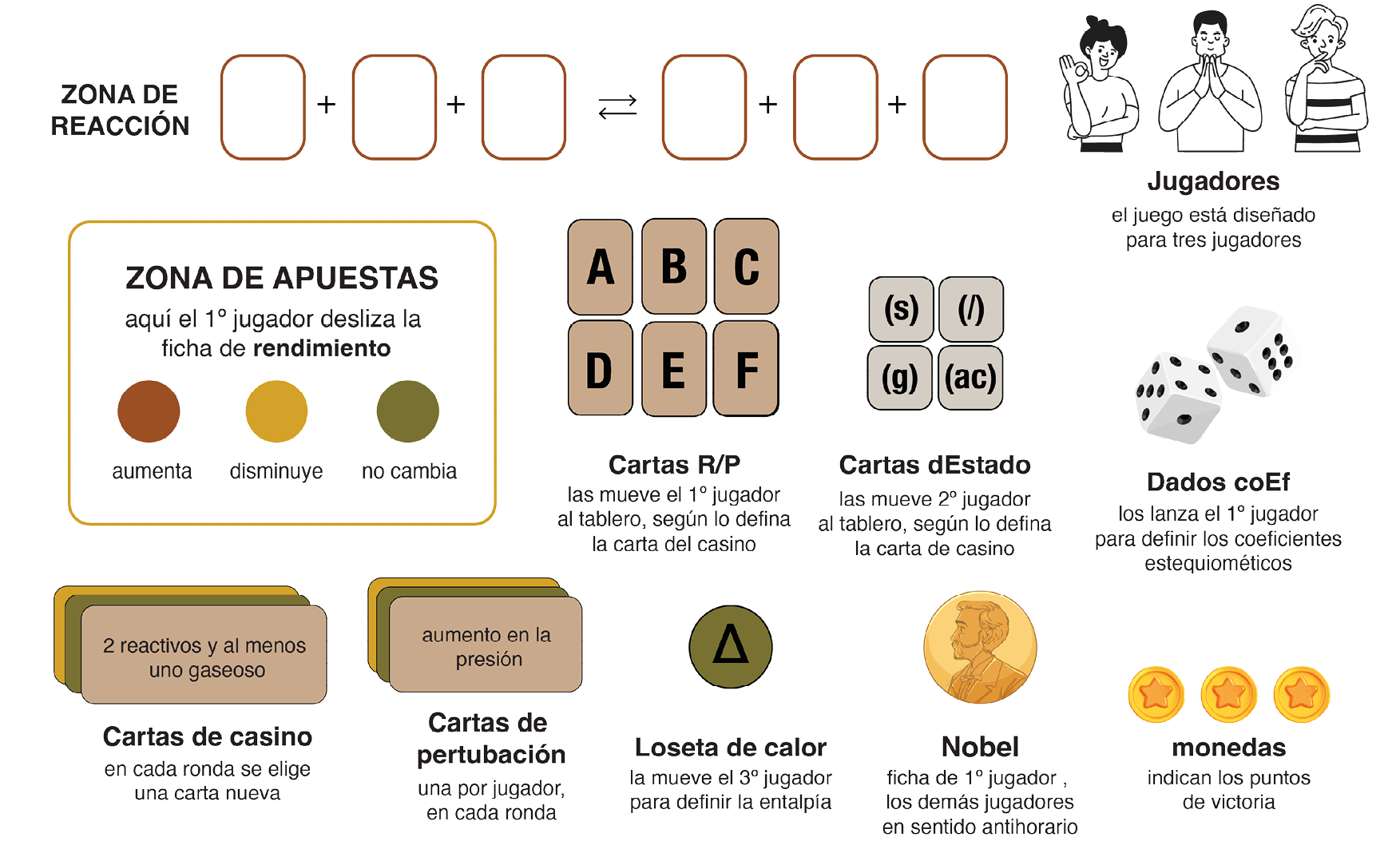 El juego cuenta con una variedad de elementos físicos diseñados para representar de forma concreta y manipulativa los conceptos de equilibrio químico. A continuación se detallan los componentes:
